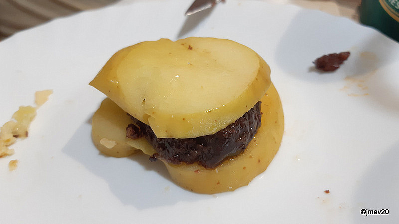 Para cenar preparamos un plato típico de la comarca: «borono» entre lonchas de manzana asada. Una delicia que nos recomendaron en la tienda donde hacíamos las compras.