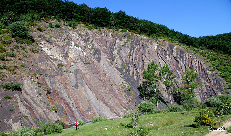 Mirando con detalle en estos estratos, que estuvieron bajo el mar hace entre 520 y 300 millones de años,se pueden observar algún fósil vegetal, como esta larga hoja de un traqueófito.