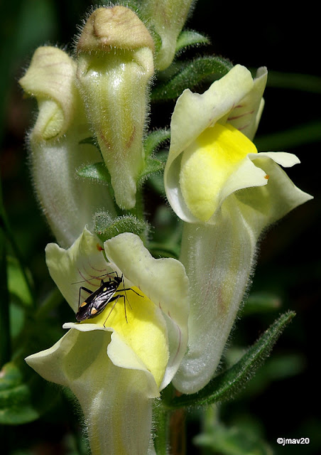 En la boca de la cueva florece Antirrhinum braun-blanquetii, en la que pulula una chinche bicolor: Capsodes flavomarginatus (id. por M. Baena).