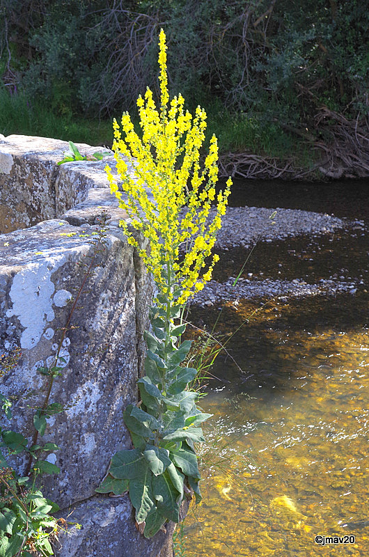 En un pretil del puente crece un bonito y florido gordolobo (Verbascum thapsus).