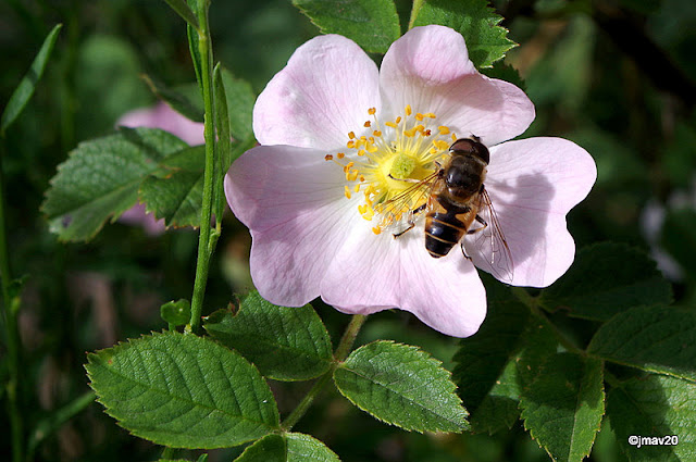 Eristalis tenax, una mosca con aspecto de avispa, sobre Rosa pimpinellifolia.
