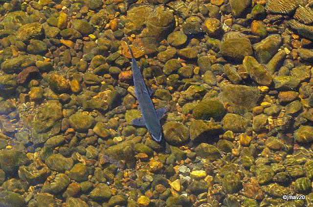 Desde el puente de Salinas fotografiamos este barbo común (Luciobarbus bocagei), al que se le notan los tubérculos nupciales que desarrolla en su boca en época de reproducción. En un principio pensamos que era una enfermedad.
