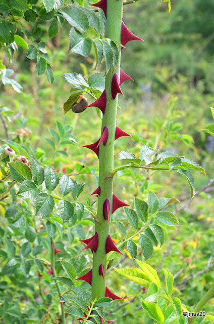 Nos llamó la atención las espinas rojas de este rosal silvestre.